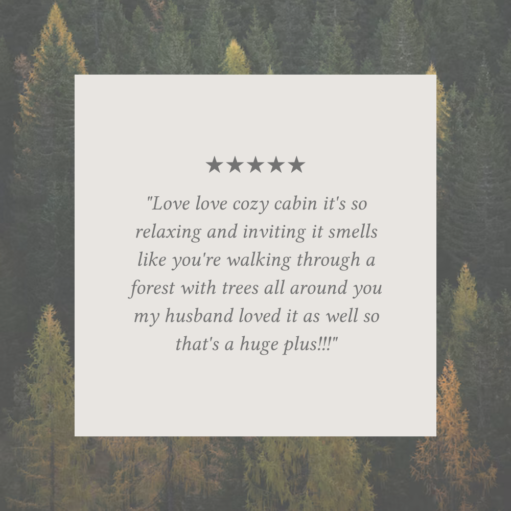 Cozy Cabin is a soothing scent of fresh mountain air, intertwined with woodsy autumn notes of fir, sandalwood, amber, and lush cedar.